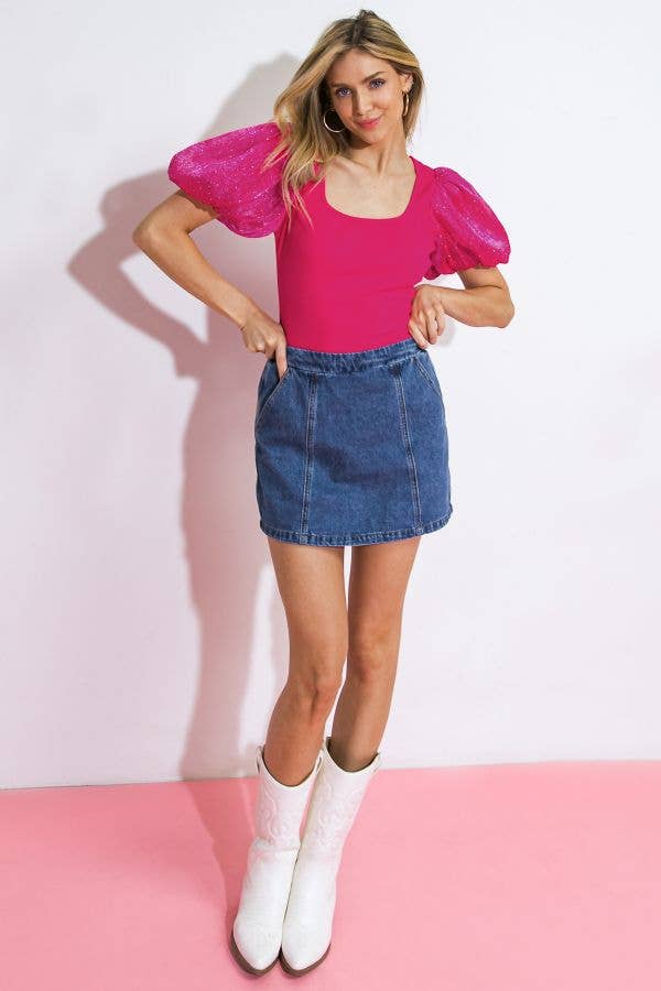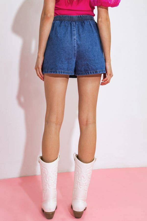 A washed denim skort featuring side pocket, skirt front, flat front waist band and smocked back waist band