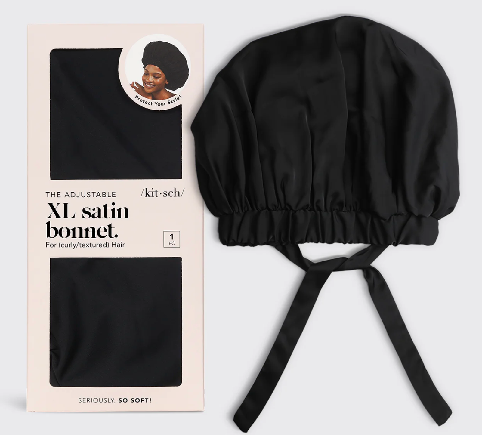 *High-quality, double-layered satin cares for your hair while you sleep *Helps maintain hair health by reducing friction, breakage, and frizz *Roomy fit preserves your hairstyle while you sleep, whether you are pairing with your Kitsch Heatless Curlers or have thick 4C curls Why You'll Love This *Satin helps lock in moisture and your natural oils, keeping your hair soft and tangle-free *Suitable for most hair types, including long and curly hair *Extra-long, adjustable ties designed to give you a secure fit *Adds a touch of glamour to your bedtime routine Pro Tip: To help strengthen hair and seal in even more moisture, treat your scalp and strands with Kitsch Balancing Scalp & Hair Oil with Rosemary & Biotin before putting on the bonnet.