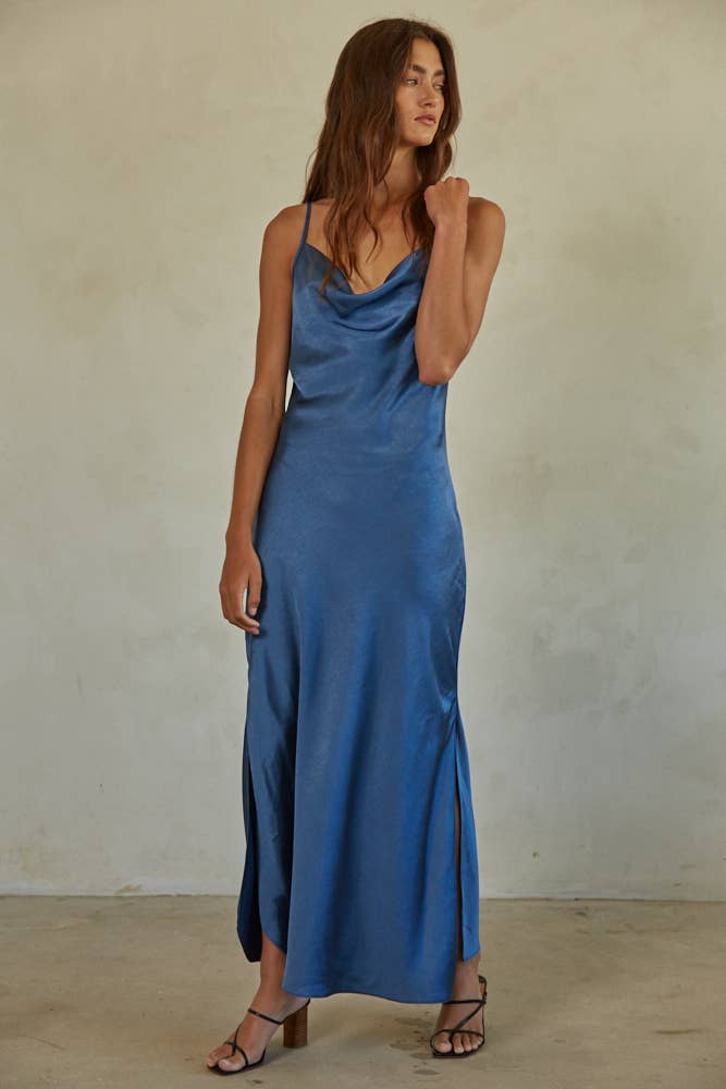 Woven Polyester Spandex Satin Cowl Neck Spaghetti Strap Midi Dress With Side Slits