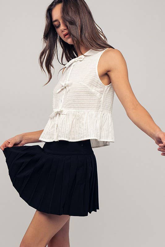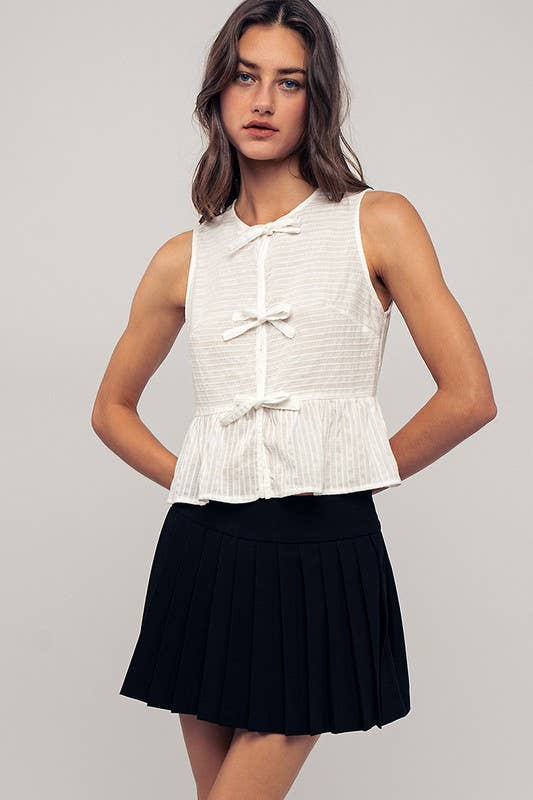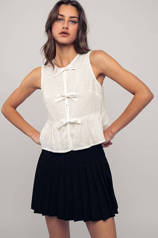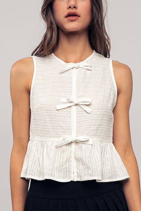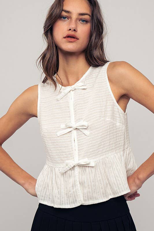 A charming sleeveless vest featuring delicate textured stripes and three feminine bow closures along the front.